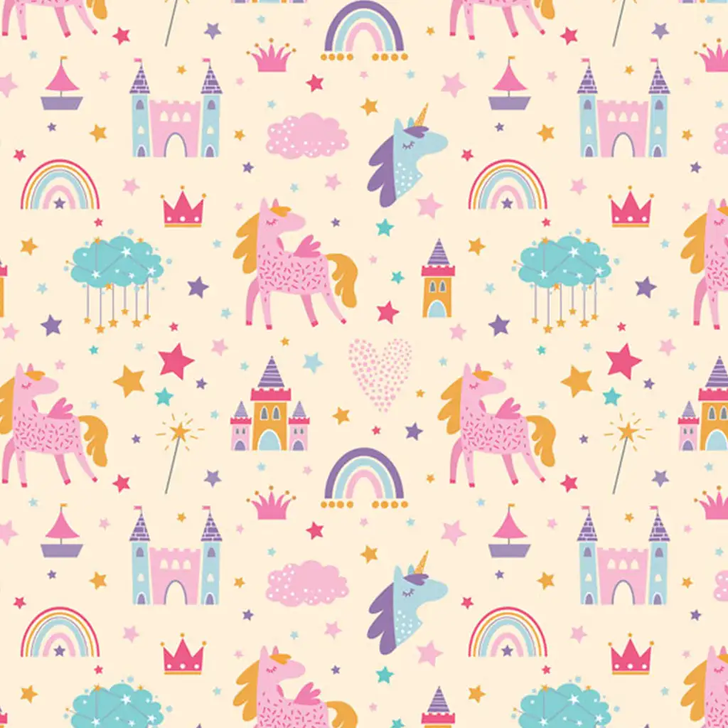 Motiv cu unicorni, castele, curcubeu și elemente dintr-o lume de basm cu stele