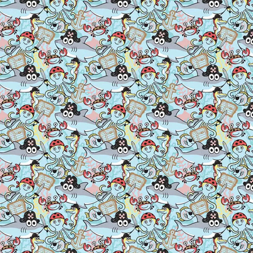 Surprinde-i pe cei mici cu un ambalaj ce evocă atmosfera unei adevărate aventuri pe mare! Hârtia de împachetat „Aventură Marină cu Pirați”, de dimensiuni 100x70 cm, este alegerea perfectă pentru cadourile copiilor, deoarece fiecare centimetru pătrat este plin de detalii captivante: caracatițe zâmbitoare cu săbii și pălărie de pirat, rechini cu bandană pe ochi, crabi mici, ancore, șerpi de mare, cufere cu comori și multe alte figurine marine vesele dansează pe fundalul albastru deschis.