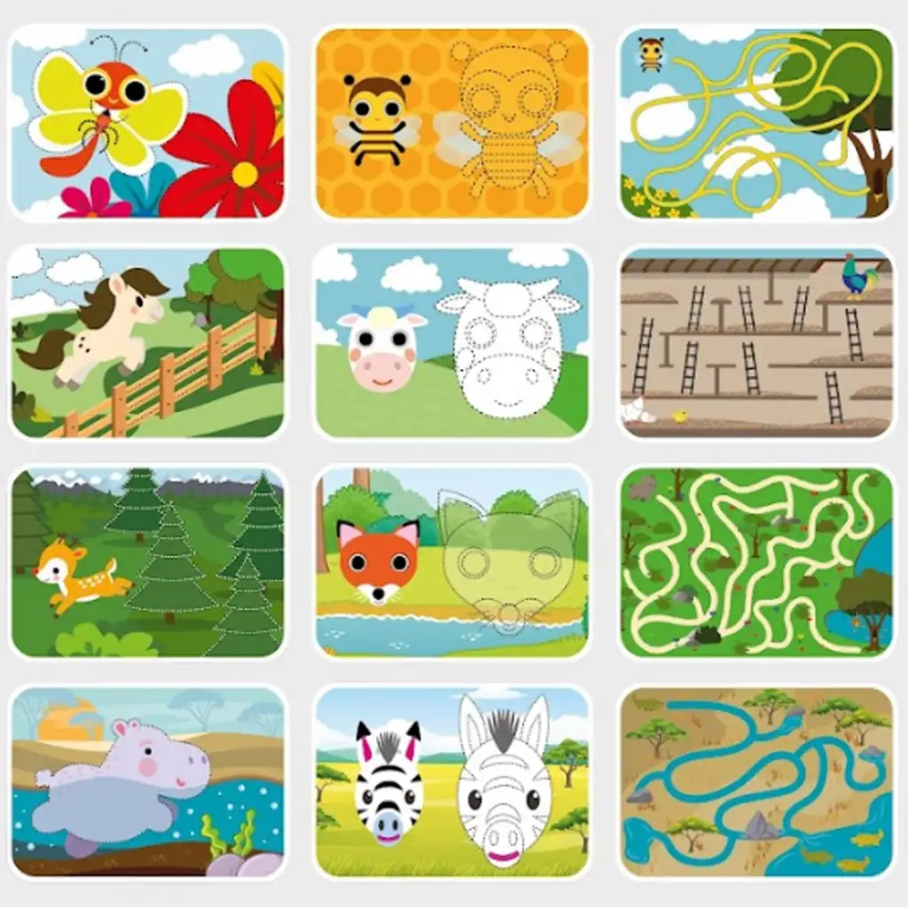 Pachetul conține 16 carduri față-verso cu suprafață ștergătoare, pe care copiii le pot rezolva cu markerul inclus, de mai multe ori, făcând acest set distractiv pe termen lung. Printre activități se numără trasarea liniilor, unirea punctelor, labirinturi și alte activități creative, toate contribuind la dezvoltarea copiilor. Lumea animalelor și sarcinile simple, dar eficiente, sunt perfecte pentru ca copiii de 3 ani și mai mari să învețe jucându-se.