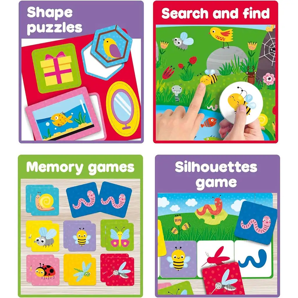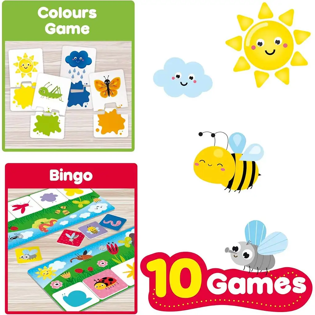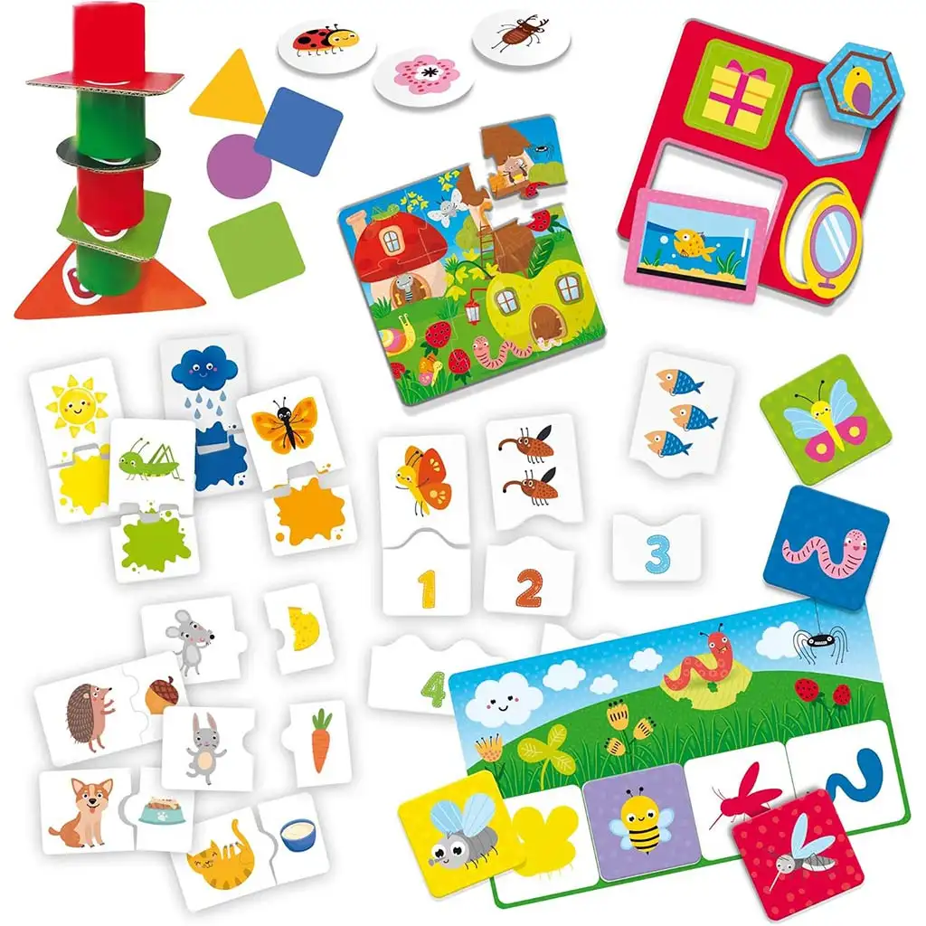 Această colecție colorată și veselă de jocuri este alegerea perfectă pentru copiii cu vârsta de peste 2 ani, care doresc să descopere lumea prin joacă. Pachetul conține 10 jocuri educative diferite care ajută la dezvoltarea intelectuală, abilităților motorii, gândirii logice și vocabularului celor mici. În cutie vei găsi turn de forme, puzzle-uri, jocuri de umbre și memorie, activități de căutare, potrivire a culorilor, jocuri cu primele numere și multe altele. Fiecare joc oferă o nouă experiență și contribuie la dezvoltarea diferitelor abilități ale copiilor, fie că este vorba de recunoașterea formelor, numerelor, animalelor sau culorilor.