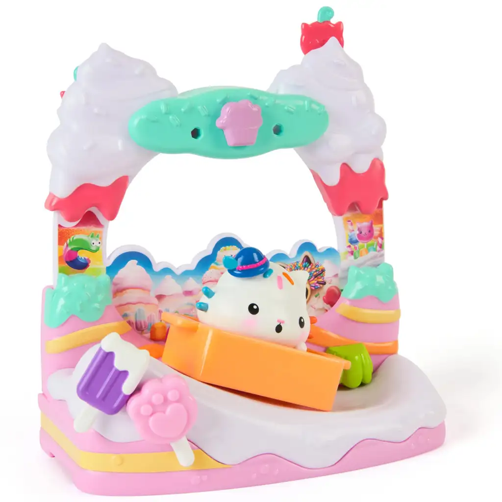 În set vei găsi figurina Pisicuța Prăjiturică și balconul de dulciuri, decorat cu detalii sclipitoare ce amintesc de înghețată și bomboane. Toboganul, decorațiunile cu înghețată și accesoriile colorate îi inspiră pe copii să recreeze scene din film sau să inventeze propriile povești. Pisicuța Prăjiturică poartă accesorii unice, iar elementele mobile fac joaca și mai distractivă.