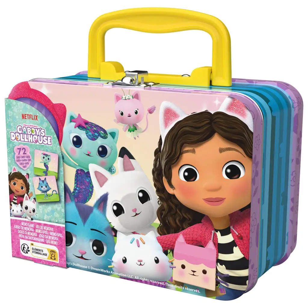 Cărțile sunt depozitate într-o valiză metalică practică și ușor de transportat, al cărei design cu închidere asigură că jocul rămâne întotdeauna în ordine și în siguranță. Decorațiunile valizei reflectă fidel lumea de poveste a casei de păpuși a lui Gabi, astfel încât copiii vor fi încântați să scoată jocul din nou și din nou.