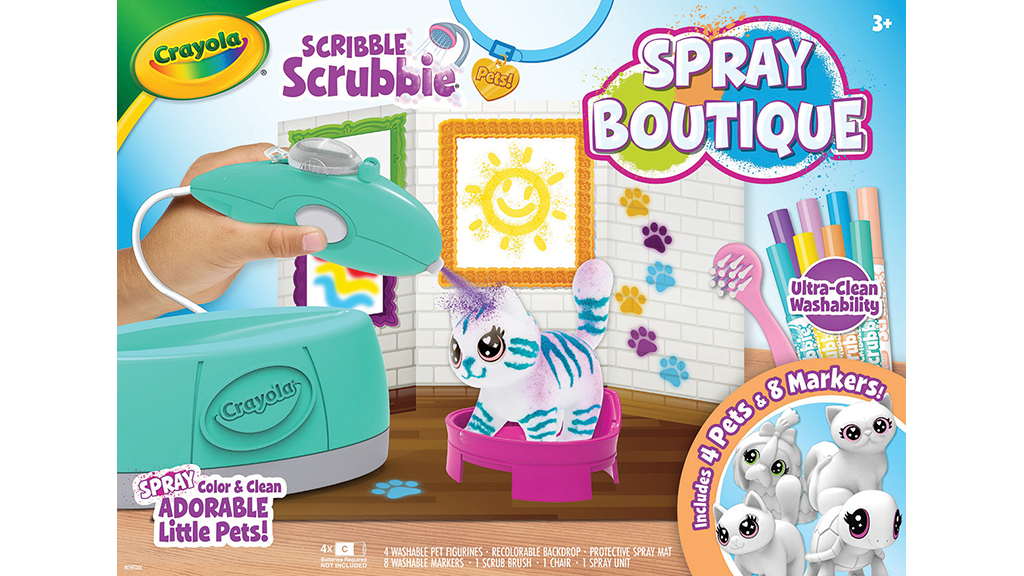 Plasează oricare dintre cele patru animale mici pe scaunul din salon pentru a personaliza aspectul lor cu cele opt markere lavabile și cu dispozitivul de suflare a aerului. Apoi spală animalele mici cu apă pentru a crea noi designuri.