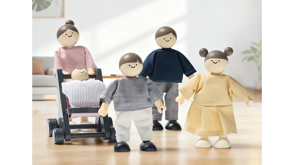 Acest set este realizat din lemn masiv de fag și placaj, la scară 1:12. Pachetul conține o figurină Anya, Apa, Fiú, Lány și Baba. Această familie de păpuși din lemn are membre flexibile, haine din bumbac și cărucior pentru păpuși, astfel încât copiii pot juca jocuri de rol și mai realiste. Datorită materialelor de calitate, este o jucărie durabilă și sigură, care va aduce bucurie tuturor membrilor familiei pentru mult timp.