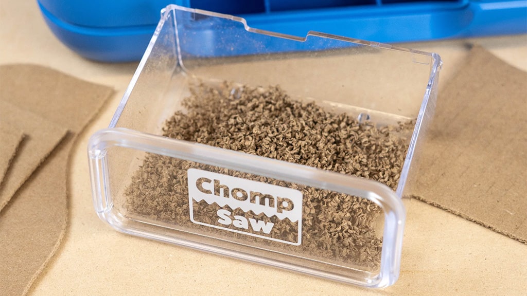 ChompSaw a fost proiectat în primul rând pentru tăierea cartonului, dar poate fi folosit excelent și pentru materiale precum țesătura, hârtia sau spuma hobby. La proiectarea ChompSaw s-a acordat o atenție deosebită siguranței — nu taie părul, degetele sau îmbrăcămintea. Cu toate acestea, pentru o creație și mai sigură și mai confortabilă, este recomandat ca copiii să-și prindă părul lung și să evite hainele largi, lejere. Pentru cea mai bună performanță, este recomandat ca îngrijitorii să golească sertarul pentru așchii de carton la fiecare 30 de minute, pentru a evita blocajele. Astfel, ChompSaw nu este doar un instrument sigur, ci și practic și ușor de folosit pentru orice activitate creativă, fie că este vorba de bricolaj acasă sau de proiecte școlare.Mici constructori; dezvoltarea abilităților motorii fine; copii creativi; pasionați de activități de lucru manual; joacă-te și arată-ți creațiile.