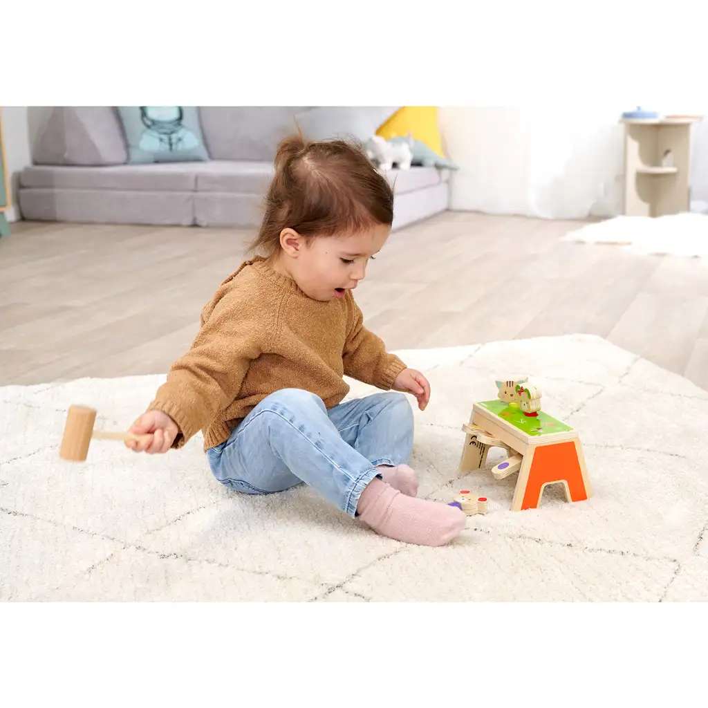 Construcția jucăriei este complet sigură, piesele de lemn sunt rotunjite și proiectate pentru mâini mici. Cele trei figurine colorate și zâmbitoare – ursuleț, cățeluș și pisicuță – apar în diferite culori și poziții, astfel încât copilul să le poată bate din nou și din nou la locul lor cu ajutorul ciocănelului de lemn inclus.