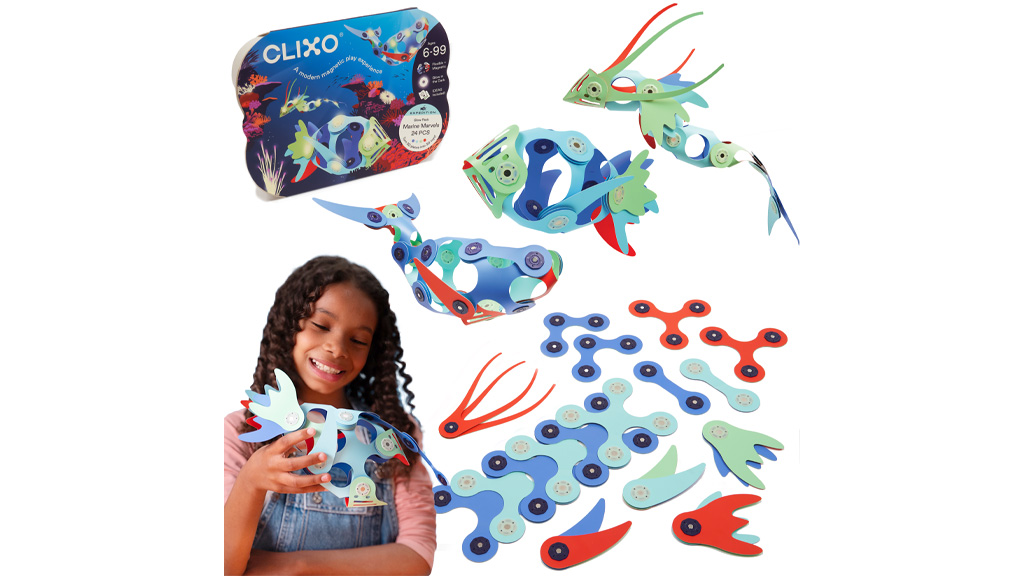 Copiii pot crea opere magnetice din 15 piese, care conțin șapte forme diferite, precum și un ghid de pornire rapidă. Disponibil în pachet verde/albastru și roz/galben.Copiii pot crea creaturi marine cu un set format din 24 de piese magnetice, care include nouă forme Clixo, inclusiv aripioare și tentacule. Setul conține și piese care strălucesc în întuneric!