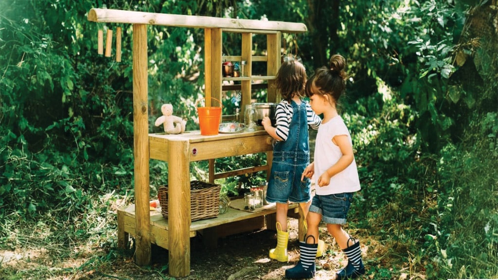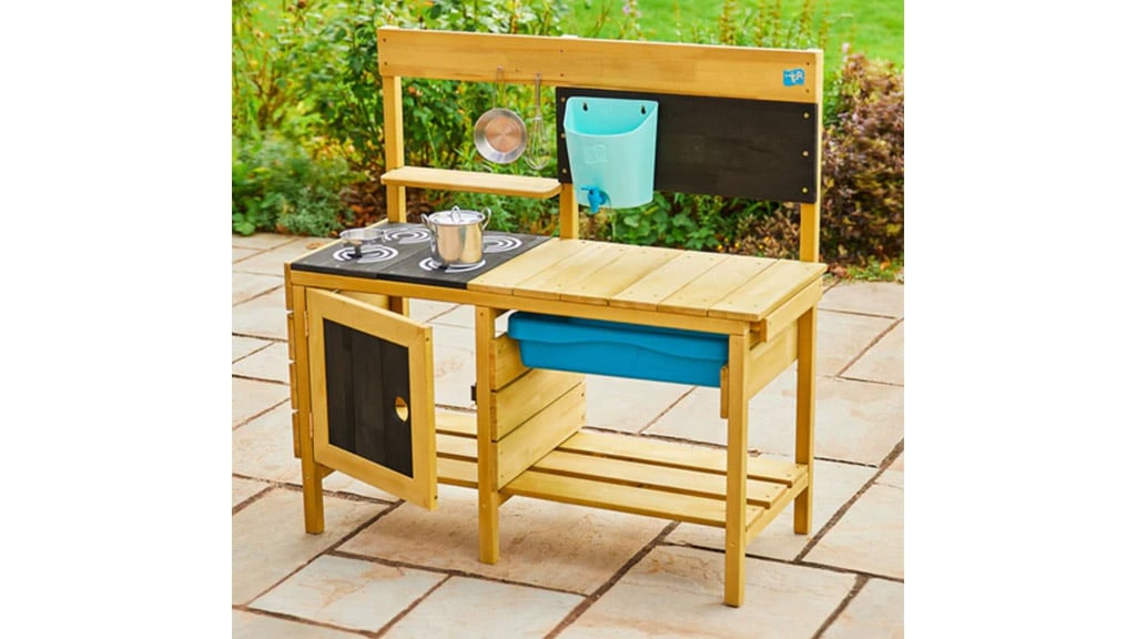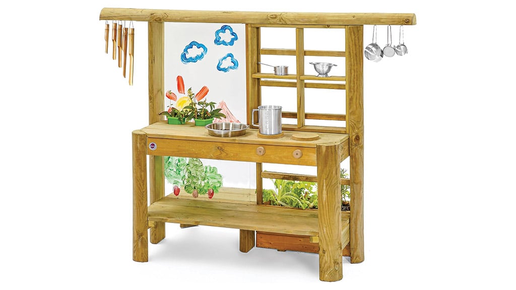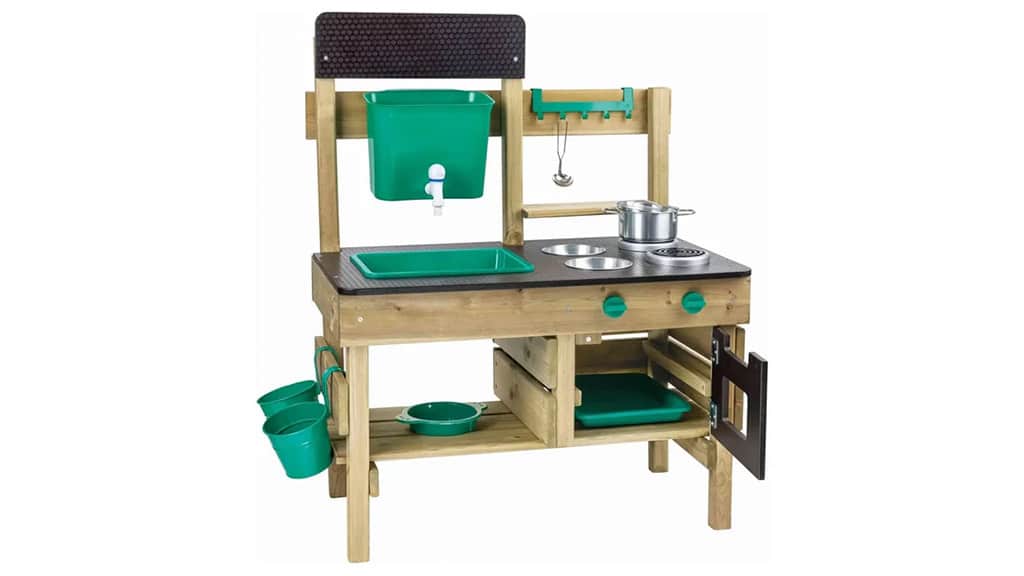 Această bucătărie de joacă pentru exterior este echipată cu tot ce au nevoie copiii pentru a pregăti prăjituri de noroi ca niște adevărați maeștri. Include un rezervor de apă de 2 litri, un robinet funcțional, vase din oțel inoxidabil, precum și o mini stropitoare. Sub aragaz se află un spațiu senzorial de depozitare, care oferă și mai multe posibilități de amestecare, zdrobire și stropire. Curățenia este la fel de distractivă, deoarece depozitul cu două straturi este prevăzut cu cârlige, astfel încât fiecare ustensilă are locul său, iar ordinea devine o experiență jucăușă.