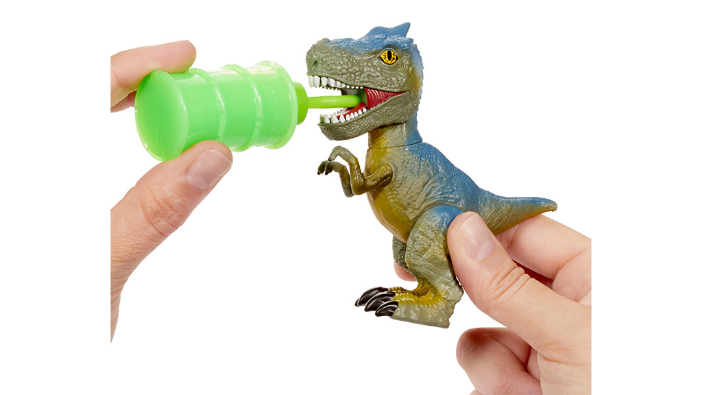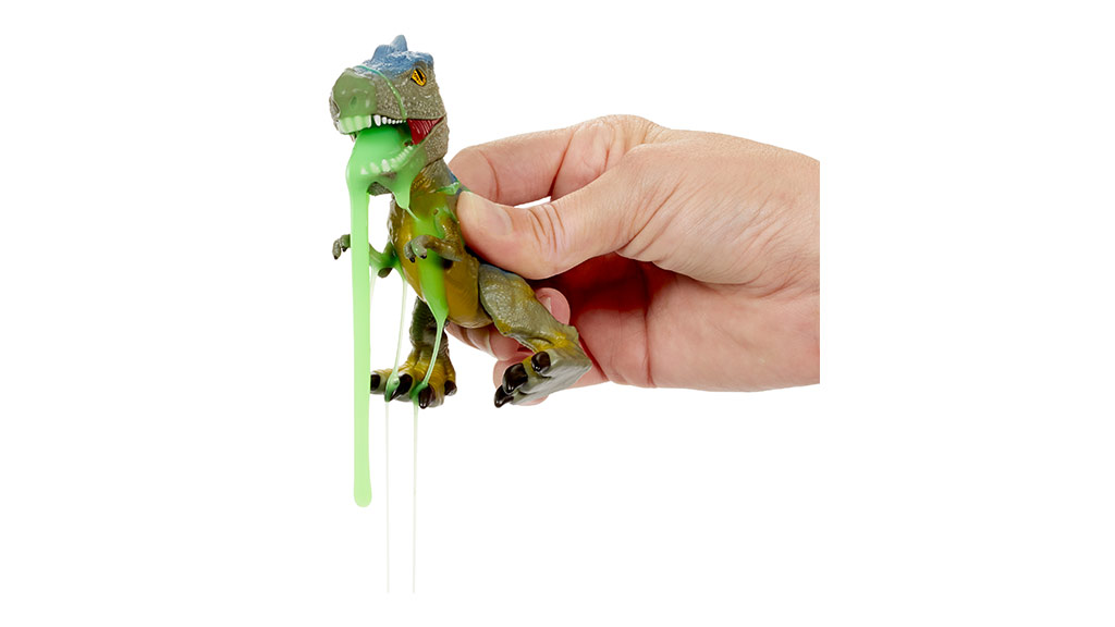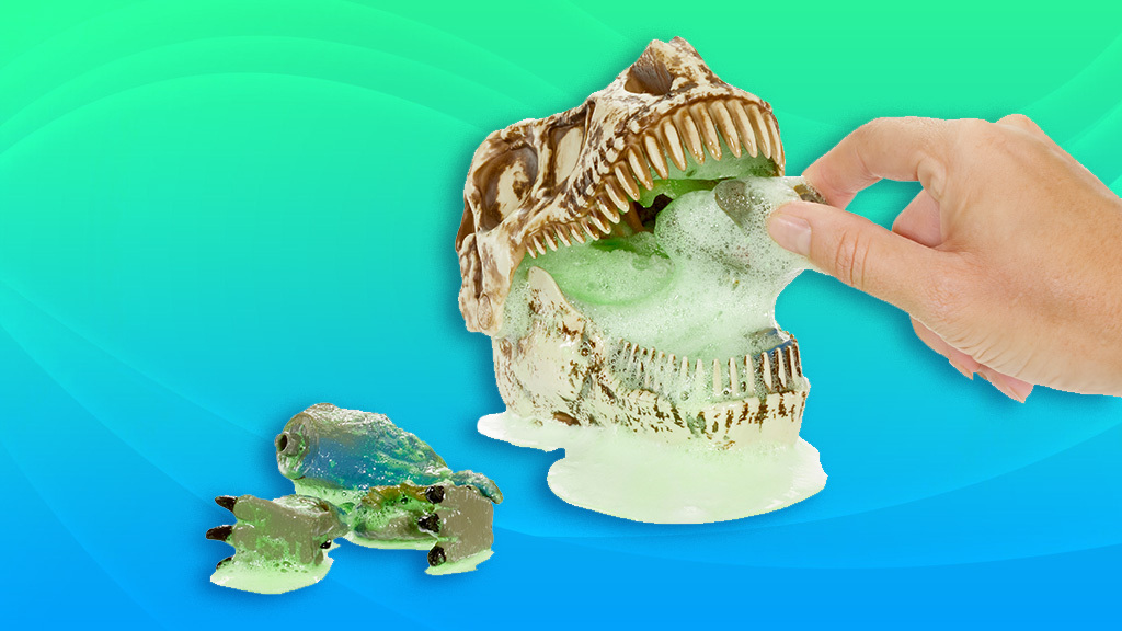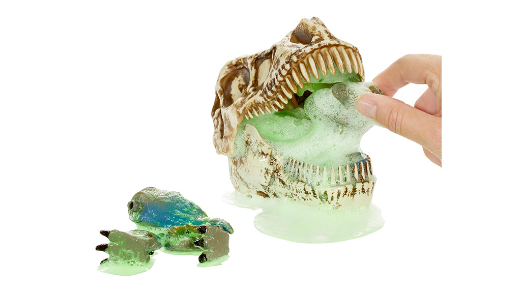 Copiii pot turna apă în acest craniu de dinozaur pentru a crea spumă și a dezvălui una dintre cele șase figurine de dinozaur ascunse! Copiii pot hrăni figurina de dinozaur inclusă cu mucusul toxic și pot face ca aceasta să vomite, să defece sau să aibă muci.