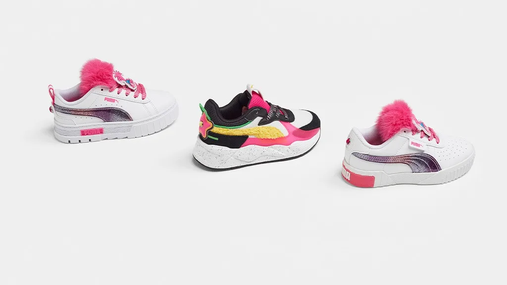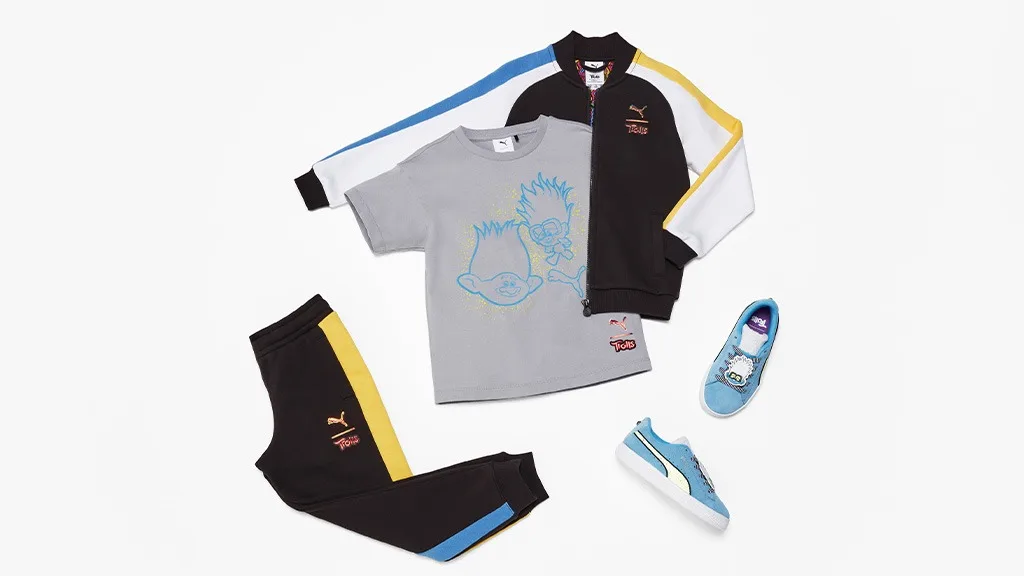 Încălțămintea prezentată în colecție de către PUMA Myze, Suede și RS-X scoate în evidență personaje din Trolls, cum ar fi Tiny Diamond și Queen Poppy, apărând pe acestea, de exemplu, imagini ale personajelor pe limbile încălțămintei, precum și cu limbi păroase, pentru a evoca coafurile Trolls.Dar distracția nu se oprește la adidași. Această colecție include de asemenea tricouri grafice, jachete de antrenament, pantaloni de antrenament și pulovere cu gât rotund, care sunt decorate cu temele iconice ale Trolilor.