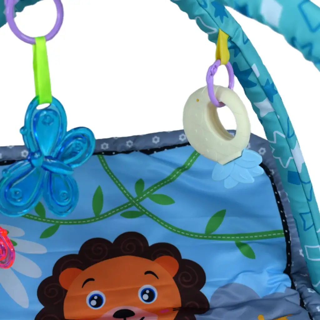 Acest covoraș de joacă pentru bebeluși este o alegere excelentă pentru cei mai mici, deoarece este extrem de practic: poate fi așezat cu ușurință oriunde, astfel încât micuții să se poată juca garantat pe o suprafață curată și moale. Covorașul de joacă, colorat în nuanțe vii, dispune de o decorație specială menită să stârnească interesul bebelușilor. În plus, covorașul are o secțiune transversală care se întinde deasupra micuților, permițându-le să ajungă la jucăriile care atârnă în fața lor. Acest element de design dezvoltă excelent mișcarea bebelușilor care stau culcați pe spate și formarea musculaturii.
