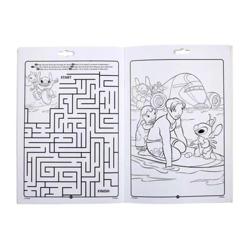 - 32 de pagini cu desene de colorat, jocuri și labirinturi cu tematica Lilo și Stitch