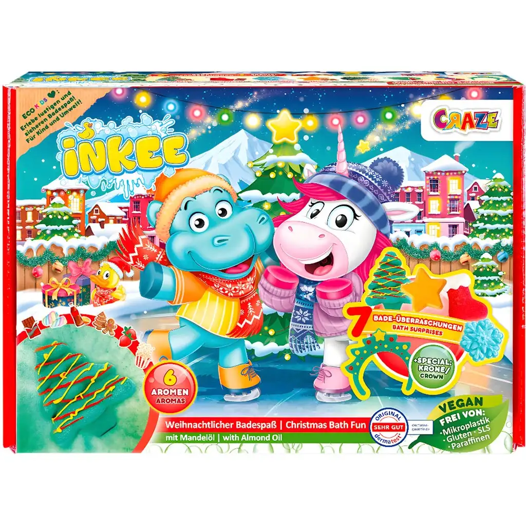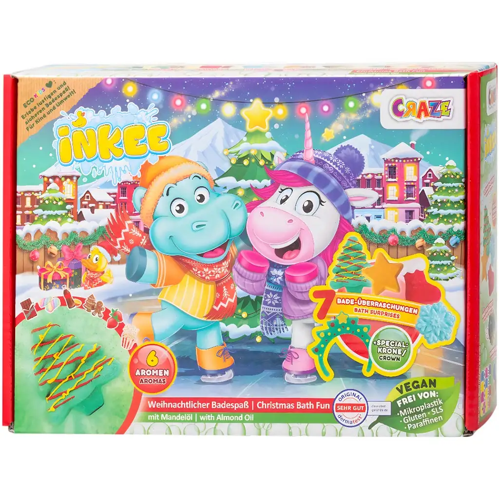 Transformă timpul de baie într-o experiență magică cu setul de jucării de baie de Crăciun Inkee, care face din fiecare baie o adevărată sărbătoare! Ediția de Crăciun a popularului set Inkee de la Craze ascunde 7 surprize diferite, astfel încât de fiecare dată copiii vor descoperi o nouă bucurie în cadă. Protagoniștii setului, hipopotamul jucăuș și prietenul său unicorn, așteaptă cu nerăbdare să vă bălăciți împreună în ape colorate, parfumate și efervescente.