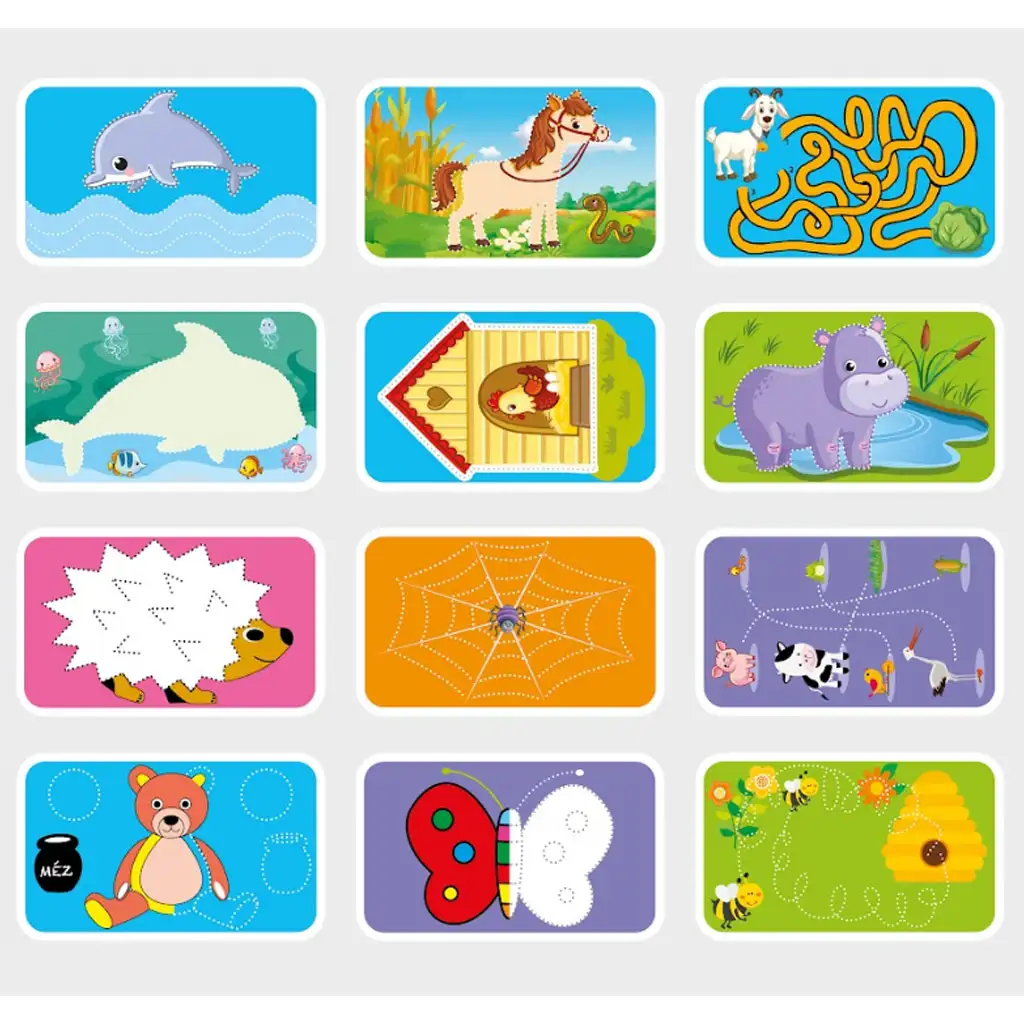 Pachetul conține 12 cărți față-verso, fiecare cu o provocare diferită legată de animale pentru copii. Printre activități se numără exerciții de trasare a liniilor, labirinturi, unirea punctelor și completarea modelelor. Cărțile sunt ștergabile, astfel încât sarcinile pot fi rezolvate din nou și din nou cu markerul inclus, asigurând posibilitatea de practică și învățare continuă.