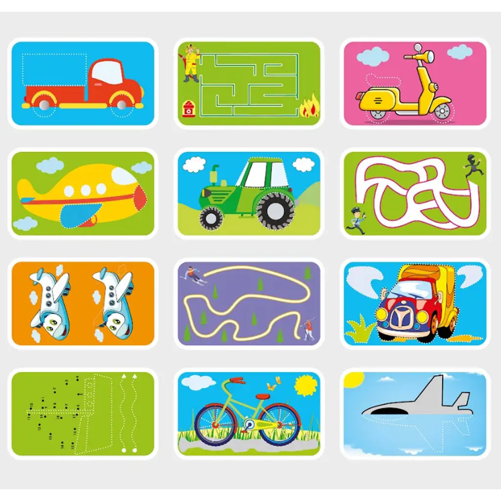 Setul conține 12 carduri față-verso, care pot fi șterse, cu diferite tipuri de activități pentru copii. Aceștia pot întâlni labirinturi, exerciții de trasare a liniilor, conectarea punctelor și completarea diferitelor forme. Markerul inclus, care poate fi șters, permite rezolvarea repetată a activităților, menținând jocul interesant pe termen lung.