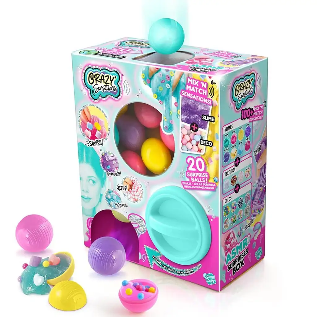 Cutia cu Surprize Crazy Sensations ASMR este combinația perfectă de creativitate, joc și experiențe senzoriale, pe care copiii (și, în secret, și adulții) o adoră! Această cutie ascunde 20 de bile colorate surpriză, fiecare oferind o experiență senzorială specială. Veți găsi înăuntru slime-uri lipicioase, spumoase, gelatinoase, săltărețe, cu biluțe și texturate, pe care le puteți amesteca, modela și strânge după bunul plac.