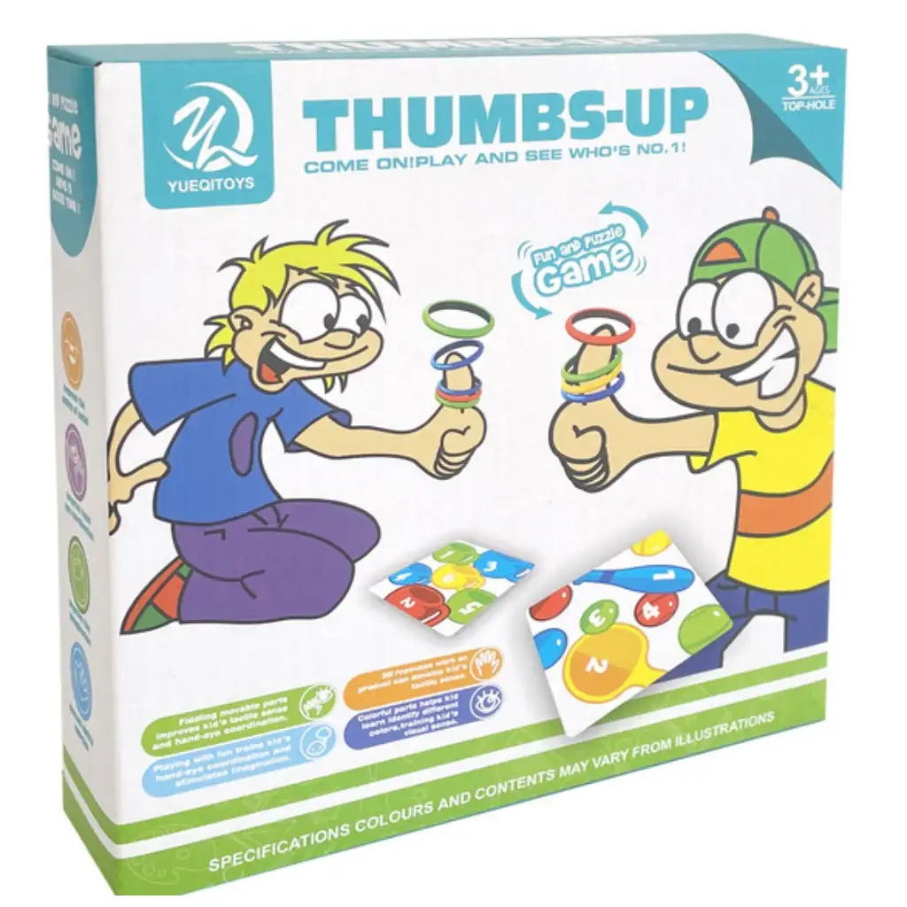 Descoperiți împreună jocul de logică "Degetul Mare în Sus!", unde viteza și îndemânarea triumfă! Acest joc colorat și palpitant este perfect pentru serile de joc în familie, unde toată lumea își poate testa reflexele. Scopul este simplu: pe baza modelului afișat pe cărți, trebuie să înșirați pe degetul mare inelele de culoarea și forma corespunzătoare în cel mai scurt timp posibil. Ușor de învățat, astfel încât și cei mai mici să se poată bucura, în timp ce își dezvoltă abilitățile de recunoaștere a culorilor și formelor, precum și abilitățile motorii fine.