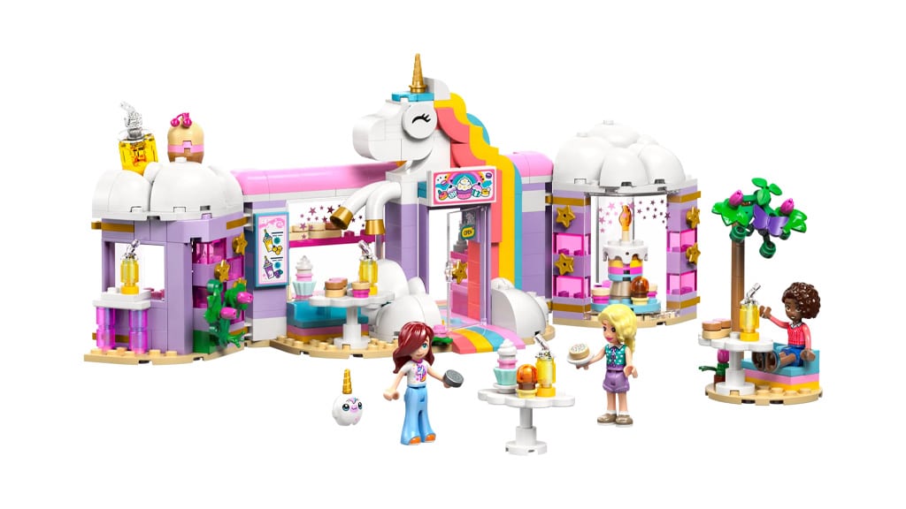 Cei mici pot construi și ei LEGO Friends Unicorn Dream Café. Acest set de construcție cu 475 de piese include trei mini figurine, un bar de sucuri și smoothie-uri, accesorii cu tematică de unicorn, un suport rotativ pentru brioșe și multe alte elemente interesante. Elementele colorate și creative ale setului ajută la dezvoltarea imaginației și a dexterității copiilor, oferind ore întregi de distracție. Motivele cu unicorni și accesoriile detaliate fac acest set deosebit de atractiv pentru orice mic constructor.