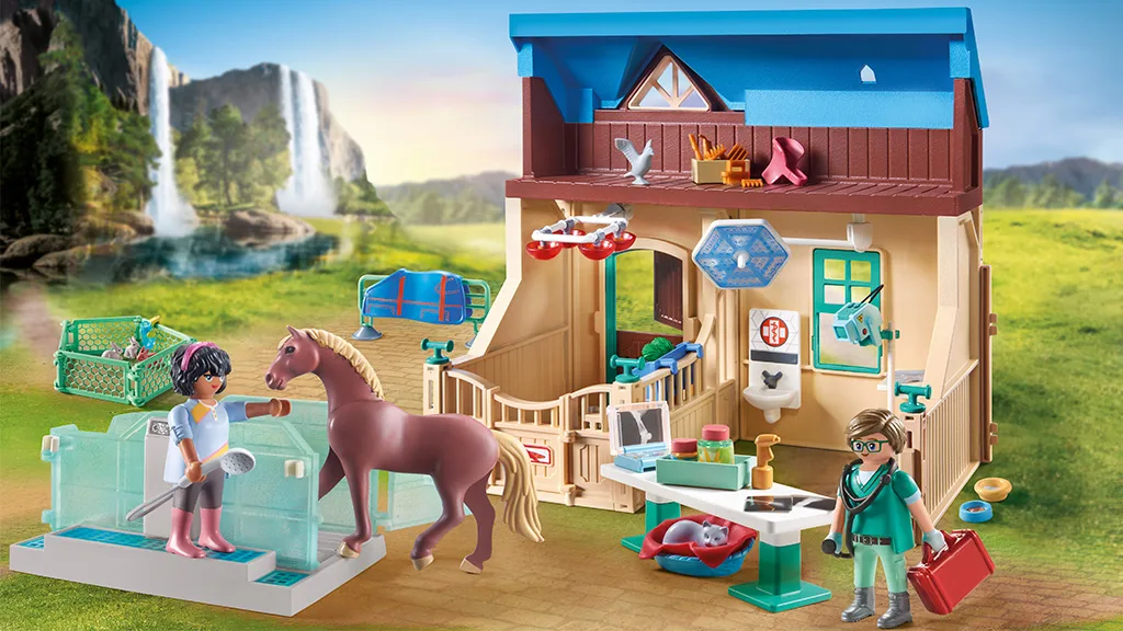 Acest set de 164 de piese conține tot ce au nevoie copiii pentru a-și crea propria clinică veterinară la Waterfall Ranch pentru îngrijirea iapelor, mânjilor și altor animale. Perfect pentru jocul imaginativ, setul include un aparat de radiografie cu radiografii, o bandă de alergare pentru cai, o piscină pentru hidroterapie și multe altele.