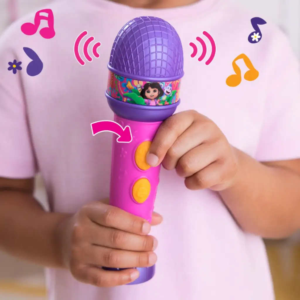 Dora, exploratoarea - microfon cu melodii – o jucărie veselă, colorată și interactivă pentru micii exploratori, cu care copiii se pot simți adevărate vedete. Microfonul mov-roz, ușor de ținut în mână, este decorat cu model Dora și umple camera cu muzică, melodii și sunete amuzante prin simpla apăsare a unui buton. Cei mici pot cânta împreună cu Dora, pot imita scenele preferate sau pot oferi un mini-concert familiei.