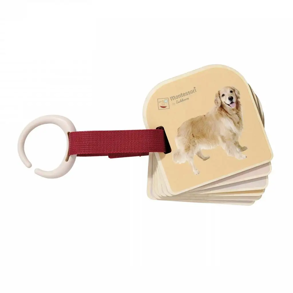 Fiecare pagină a cărții conține o fotografie realistă cu animale domestice și insecte, precum câine, fluture sau melc – astfel copiii pot face cunoștință de timpuriu cu imagini din lumea reală, care le dezvoltă abilitățile de observare. Cartonașele sunt fabricate din lemn rezistent, cu colțuri rotunjite, pentru a fi complet sigure chiar și pentru cele mai mici mâini.