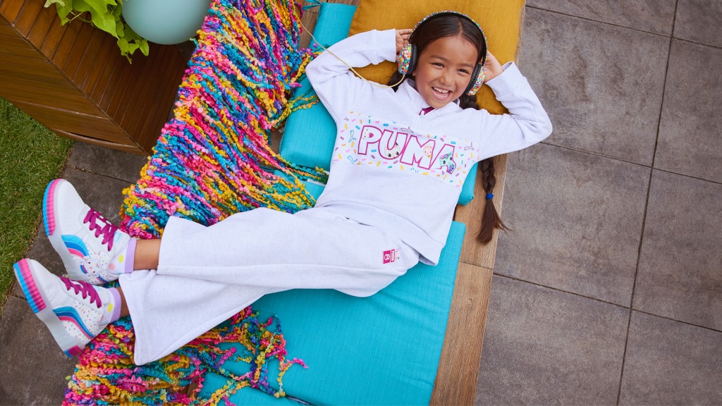 Pentru copiii care nu pot alege un personaj preferat, PUMA are grijă de ei (în material moale de pulover). Unul dintre seturile de 2 piese PUMA x Gabis Dollhouse include imagini cu MerCat, prietenii săi și un model acoperit cu solzi. Setul include o fustă și o pereche de colanți care prezintă un model similar de solzi.