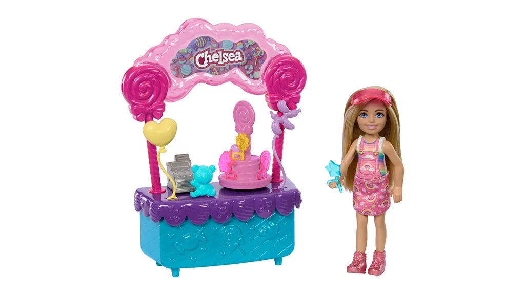 Copiii se pot bucura de dulciuri alături de Chelsea și setul ei de joc Standul de Bomboane Acadele. Îmbrăcată într-o drăguță rochie roz și sub o umbrelă de aceeași culoare, Chelsea își conduce standul cu delicii de acadele, un drăguț ursuleț de pluș și baloane de petrecere.