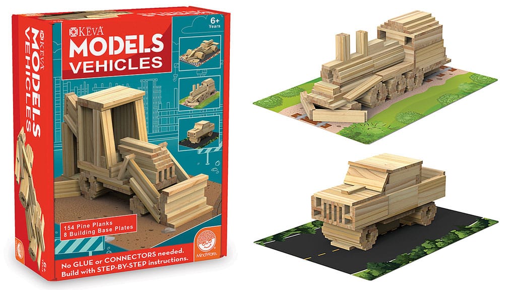Copiii pot construi patru tipuri de vehicule din lemn – locomotivă cu aburi, excavator, maşină de curse şi camion cu platformă – din peste 150 de piese de construcție KEVA tăiate cu precizie. Nu sunt necesare adeziv sau conectori. Acest set prietenos cu STEM conține plăci de bază și o carte de instrucțiuni care ajută la dezvoltarea gândirii critice și a creativității, în timp ce copiii construiesc, demontează și recreează. Astfel, ei pot avea parte de ore întregi de distracție practică, învățând și dezvoltându-se prin joacă.