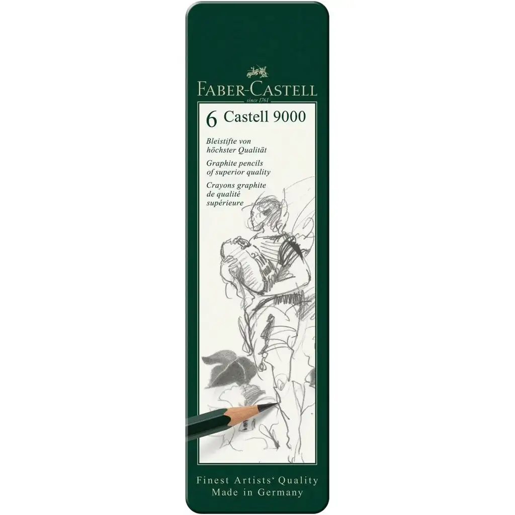 Faber-Castell: Set de 6 creioane grafit Castell 9000 în cutie metalicăFaber-Castell: Set de 6 creioane grafit Castell 9000 în cutie metalică