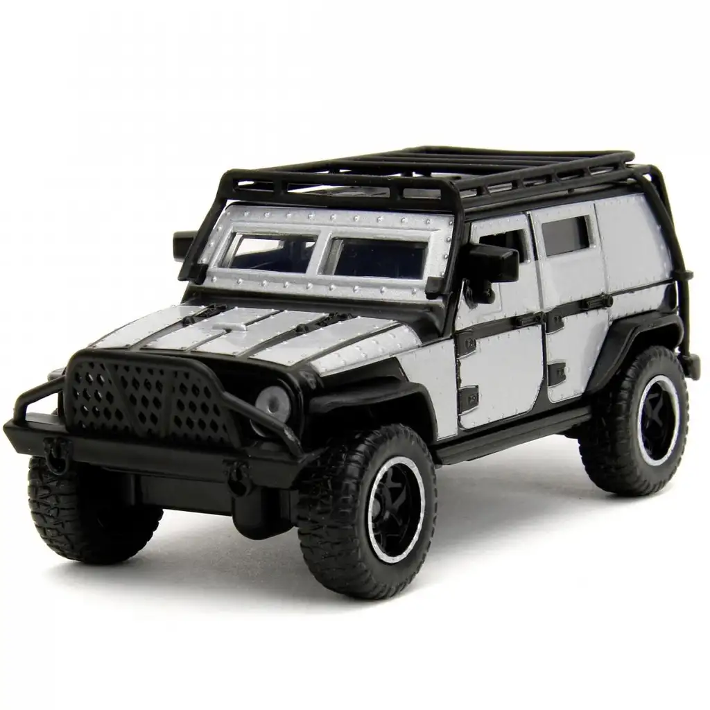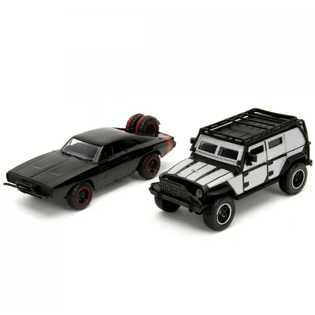 Muscle car-ul negru Charger R/T al lui Dom, cu aspectul său agresiv și impunător, amintește imediat de cele mai palpitante momente din filme. Roțile off-road cu margine roșie și roata de rezervă din spate îi conferă un aspect autentic de teren accidentat. Jeep-ul Wrangler al lui Tej, în schimb, este blindat, cu exterior argintiu-negru, portbagaj pe acoperiș și bară de protecție masivă – pregătit pentru cele mai dure acțiuni.