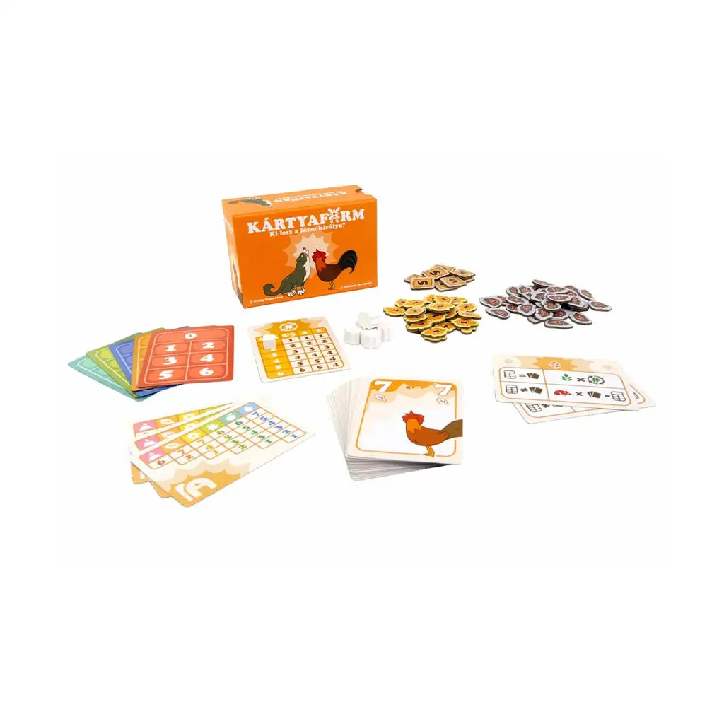 Jocul de societate Kártyafarm este un joc de cărți cu trick-taking cu adevărat special, în care animalele de la fermă nu sunt doar gălăgioase, ci și viclene. Aici nu este suficient să câștigi pur și simplu rundele: trebuie să prezici dinainte exact câte trick-uri vei lua, iar la finalul jocului primești recompensa doar dacă îți îndeplinești perfect angajamentul. La fermă, fiecare animal concurează pentru putere – găinile cotcodăcitoare, vacile mugitoare și caprele încăpățânate, toate sunt gata de acțiune. La începutul jocului vezi ce culori de cărți sunt în joc, dar valorile rămân secrete, așa că fiecare angajament este o decizie riscantă. În timpul jocului trebuie să urmezi culoarea solicitată, dar dacă nu ai carte potrivită, poți arunca orice animal. În mod obișnuit, trick-ul este câștigat de valoarea cea mai mare, însă valorile egale se anulează reciproc, astfel că și o carte mai mică poate aduce o victorie neașteptată. La sfârșitul rundei doar cel care a reușit să ia exact atâtea trick-uri câte a declarat primește puncte – orice diferență aduce puncte negative. Competiția durează șase runde, iar la final se va vedea cine devine regele fermei. Este un joc rapid de învățat, dar totodată tactic, care garantează distracția atât în familie, cât și între prieteni.
