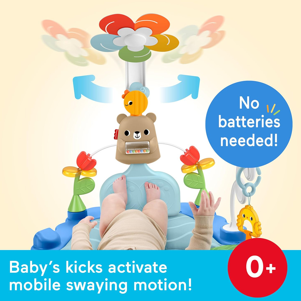 Covorașul interactiv cu ursuleț Mattel Fisher-Price este alegerea perfectă dacă dorești să dezvolți într-un mod jucăuș simțurile și mișcarea bebelușului tău încă de la naștere. Pe covorașul moale și colorat, întins pe spate sau pe burtă, micuțul poate descoperi diverse texturi, sunete și forme. Floarea rotativă și jucăriile suspendate atașate la elementul central cu ursuleț reacționează la mișcările bebelușului, astfel fiecare lovitură cu piciorul oferă o experiență palpitantă. Elementele interactive ajută la dezvoltarea coordonării ochi-mână, iar copilul se poate observa și în oglindă. Este practic faptul că funcționează fără baterii, astfel este întotdeauna gata de joacă, acasă sau chiar în timpul călătoriilor.