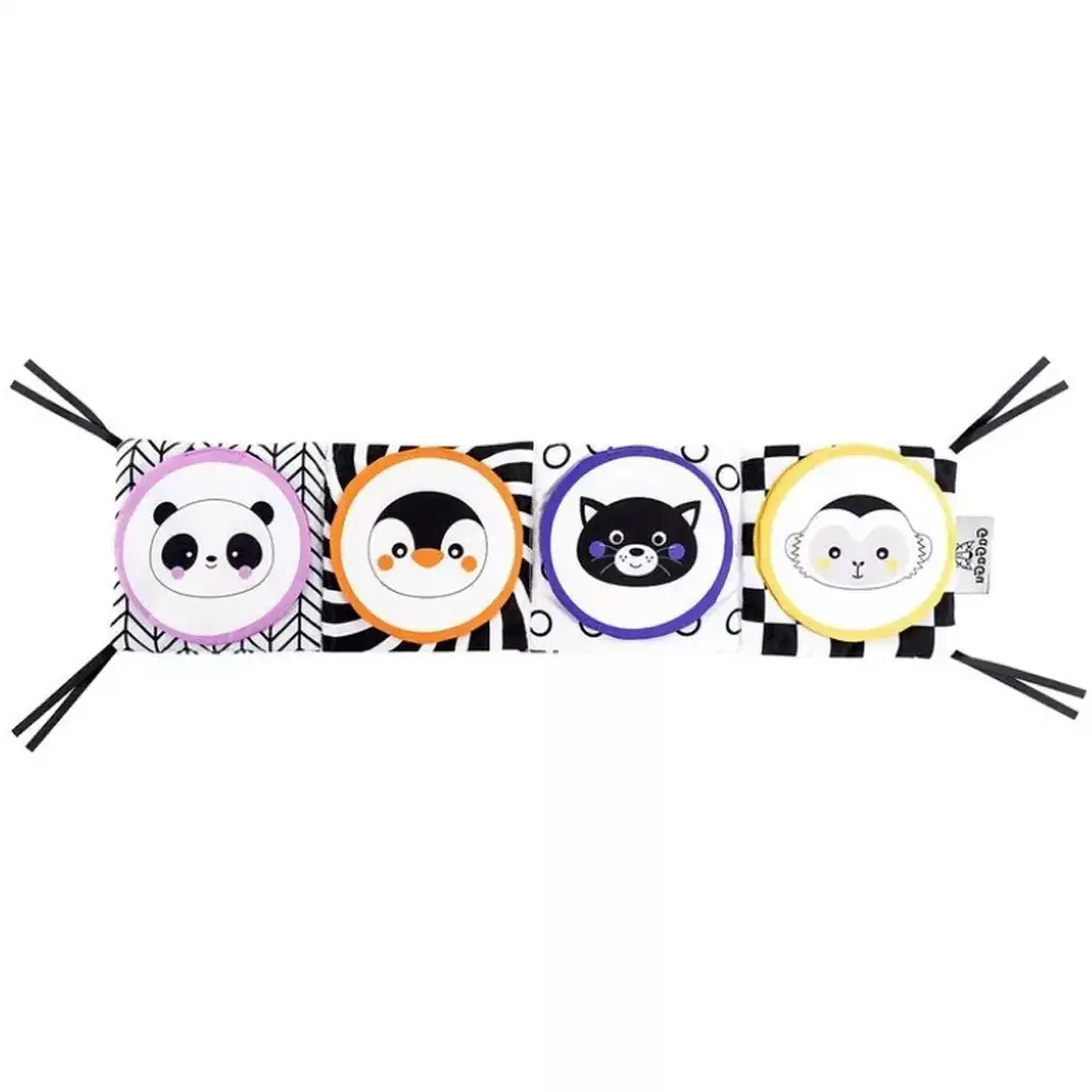 Cartea este realizată cu modele contrastante alb-negru și detalii în culori vii, care sunt deosebit de importante pentru sprijinirea dezvoltării vizuale a nou-născuților. Figurinele drăguțe de animale – precum panda, pinguinul, pisica și maimuța – atrag interesul bebelușului, stimulează concentrarea atenției și dezvoltarea coordonării mână-ochi.