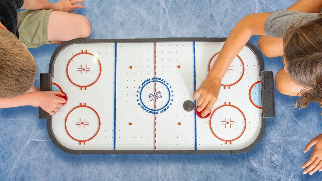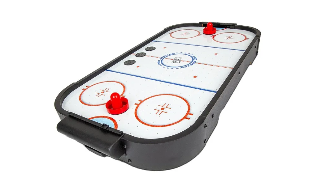Copiii pot lua cu ei oriunde emoția și distracția jocului de air hockey cu acest joc de masă portabil. Masa de 30 de inch se încadrează aproape pe orice birou sau masă și este perfectă pentru a juca oriunde și oricând. Jocul include un ventilator preinstalat care asigură un flux puternic de aer pentru o desfășurare lină a jocului.