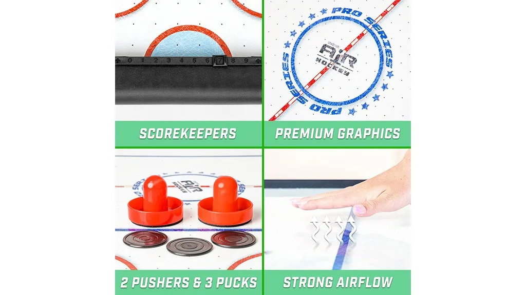 Jocul dispune de o suprafață de joc planificată cu un ventilator preinstalat pentru o desfășurare lină a jocului și cu butoane ușor de apucat. Copiii de 6 ani și mai mari își pot îmbunătăți abilitățile motorii fine și pot dezvolta abilități sociale prin jocul clasic cu prietenii și familia. Suprafața de joc preasamblată este perfectă pentru divertismentul mobil și poate fi jucată pe orice suprafață plană.