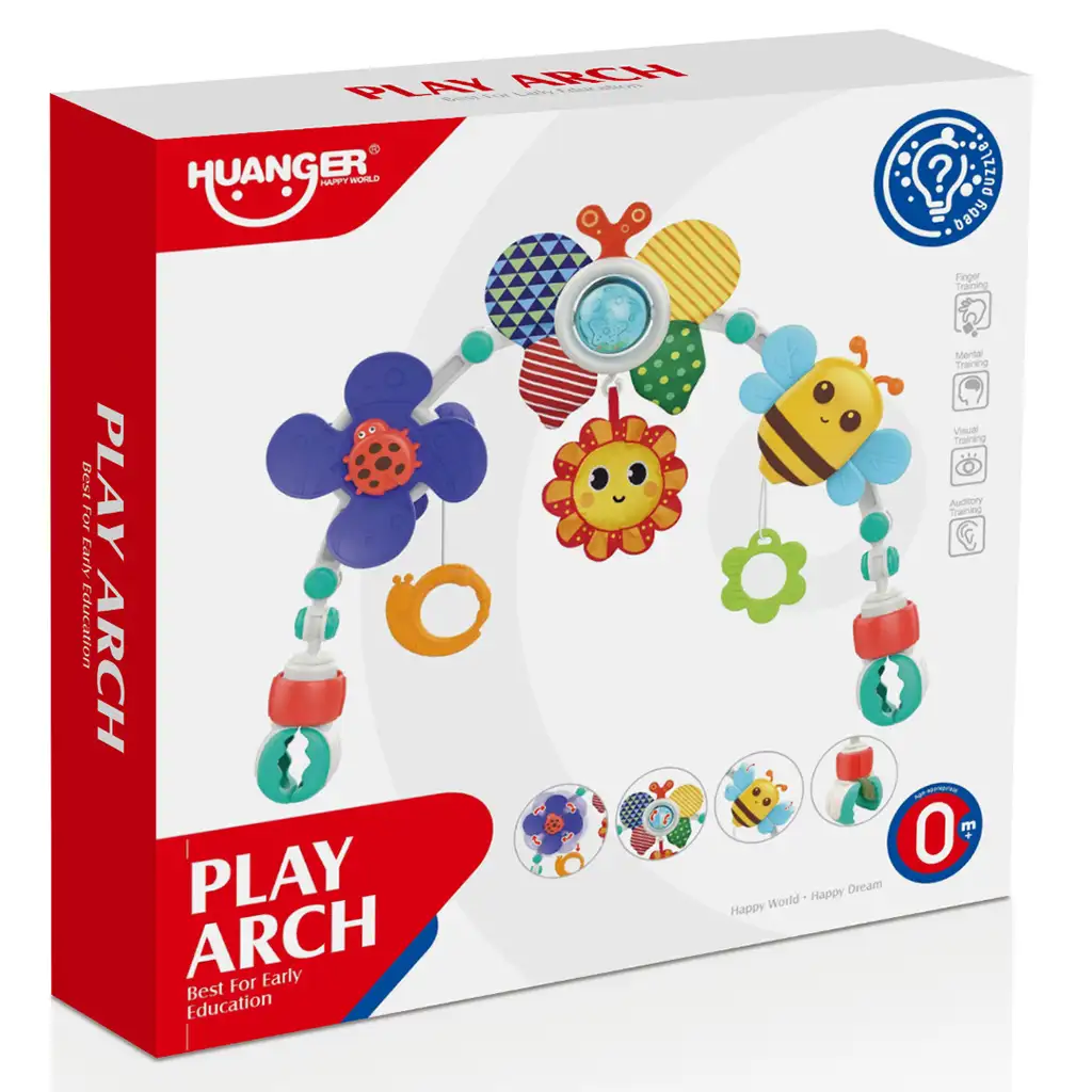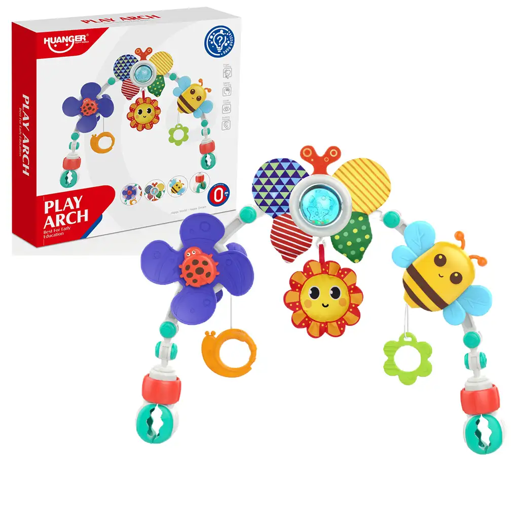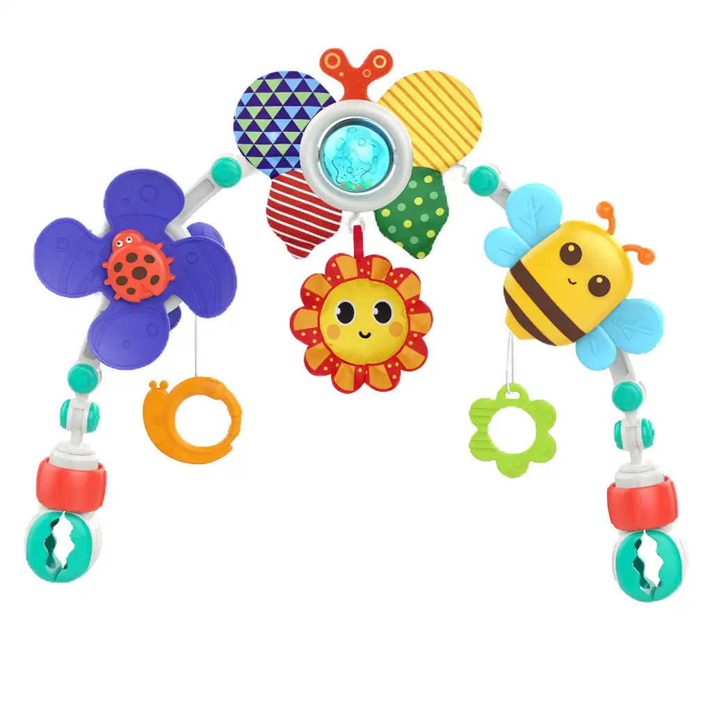 Pe podul de jucării se găsesc un albinuță veselă, un soare, un fluture și o buburuză care stimulează excelent simțurile și curiozitatea bebelușilor. Aceste elemente de joc au culori vii și diverse texturi, care ajută la dezvoltarea vederii și a simțului tactil. În plus, elementele atârnătoare de pe podul de jucării trezesc și mai mult interesul copilului și îl încurajează să se joace.