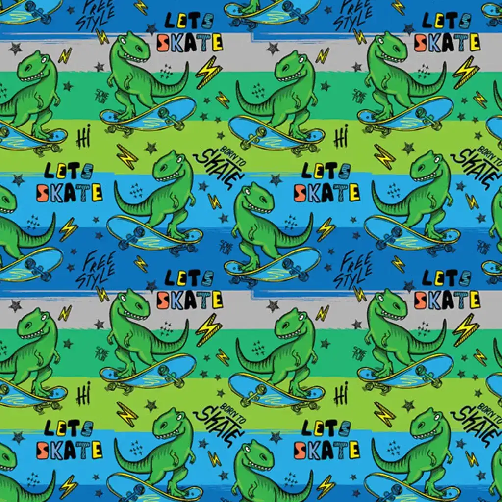 Modelul este modern și jucăuș: figurinele simpatice de T-Rex zboară pe skateboarduri albastre, în timp ce fundalul dungat – în nuanțe de verde, albastru și gri – face ca aspectul general să fie și mai interesant. Inscripțiile „Let’s Skate” și „Freestyle” amplifică și mai mult atmosfera de stil urban, care va fi cu siguranță pe placul oricărui tânăr care primește un cadou.