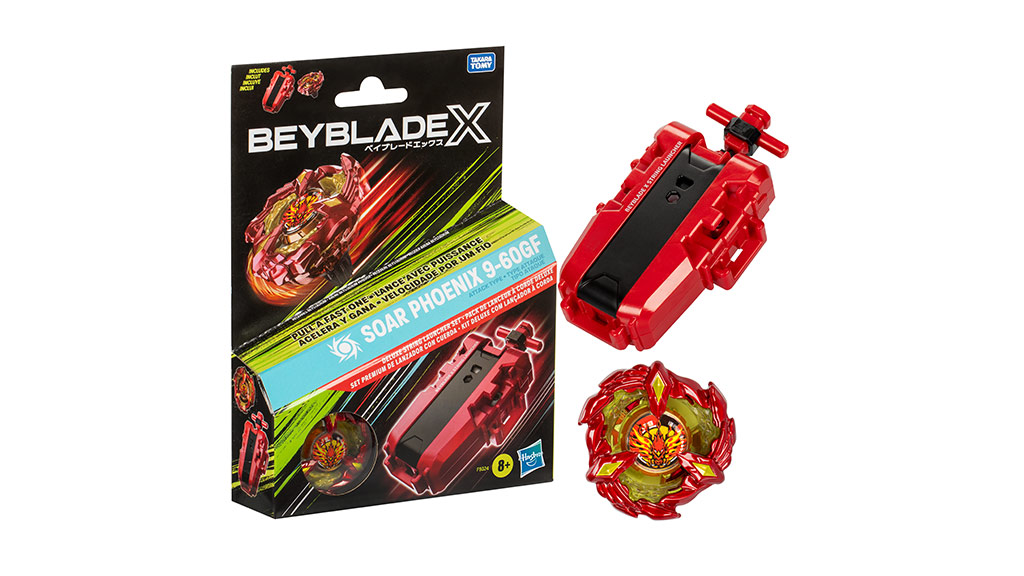 Copiii își pot îmbunătăți jocul cu ajutorul setului Beyblade X Soar Phoenix Deluxe String Launcher, care include beyblade-ul Soar Phoenix 9-60GF Attack Type și lansatorul deluxe cu sfoară. De asemenea, pot alege și Beyblade X Official Winder Launcher, care are o sfoară de 10 inci pentru bătălii super rapide.