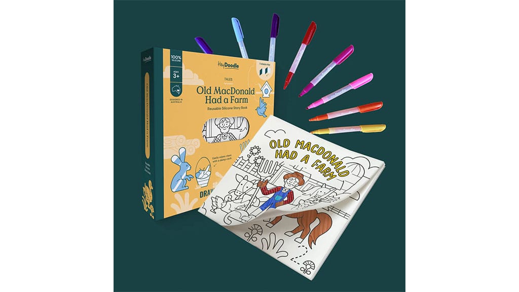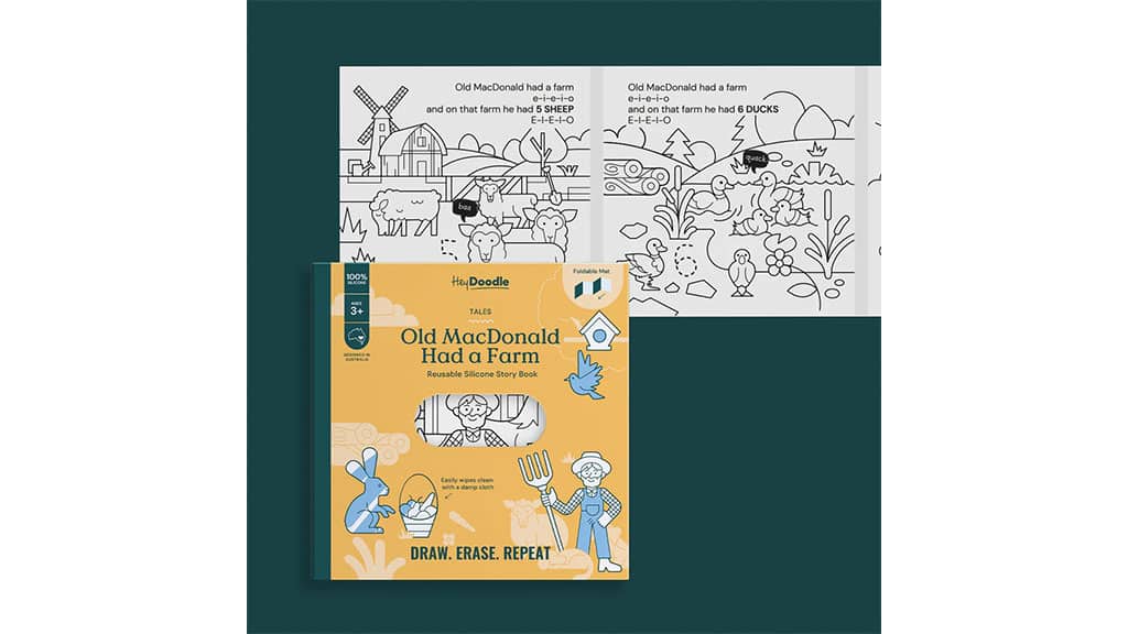 Cartea de colorat reutilizabilă HeyDoodle Old MacDonald conține numeroase elemente captivante pe o singură pagină. Paginile sunt realizate din silicon moale, astfel încât copiii le pot colora din nou și din nou. Pentru a curăța paginile și a pregăti o nouă pânză, este nevoie doar de un șervețel umed. Fiecare pagină conține numere, cuvinte și animale, oferind copiilor o mulțime de oportunități de a învăța să recunoască aceste forme — totul în timp ce se distrează.