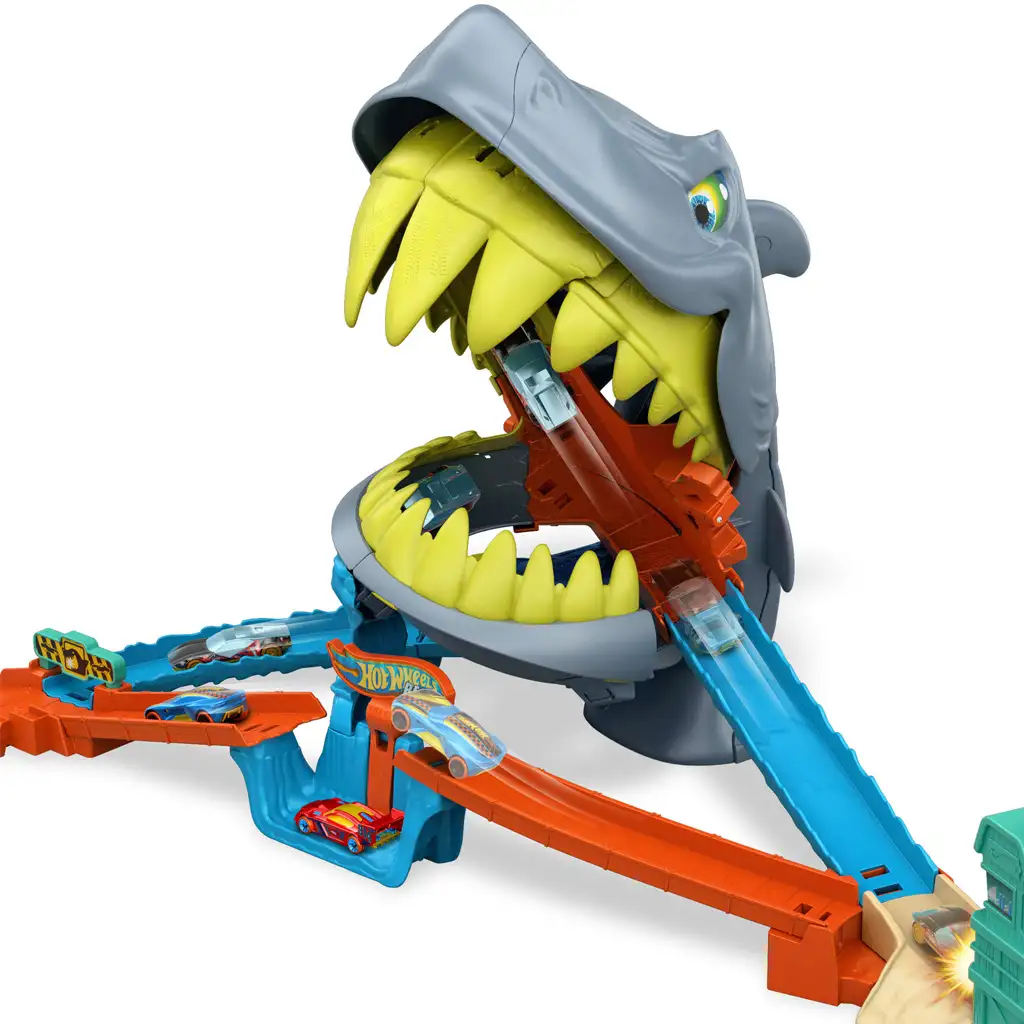 Pregătește-te pentru o misiune de salvare plină de suspans cu setul de pistă Hot Wheels Atacul rechinului! Copilul tău poate deveni un adevărat erou în timp ce înfruntă un rechin uriaș cu dinți ascuțiți, care poate ataca în orice moment. Sarcina nu este ușoară: trebuie lansată mașinuța cu forța potrivită pentru a trece prin gura larg deschisă a rechinului, a executa spectaculoasa buclă în formă de opt și a doborî prădătorul marin. Dacă lansarea este prea precaută, rechinul își va închide maxilarul și „va înghiți” mașinuța — ceea ce face jocul și mai palpitant!