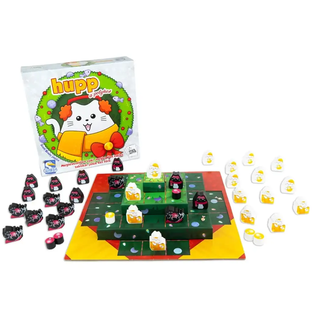 Deceptiv de drăgălaș, surprinzător de complex – acesta este Hupp, pufosul, un duel tactic pentru doi jucători, unde bradul de Crăciun nu se umple doar cu globuri, ci și cu pisici șmechere! Jocul pare fermecător la prima vedere – la urma urmei, cui nu i-ar plăcea să aranjeze figurine de pisici îmbrăcate în pulover festiv și cu cadouri în lăbuțe în jurul bradului? Dar nu te lăsa păcălit de aspectul pufos: acest joc este o adevărată provocare logică, unde fiecare mișcare contează!