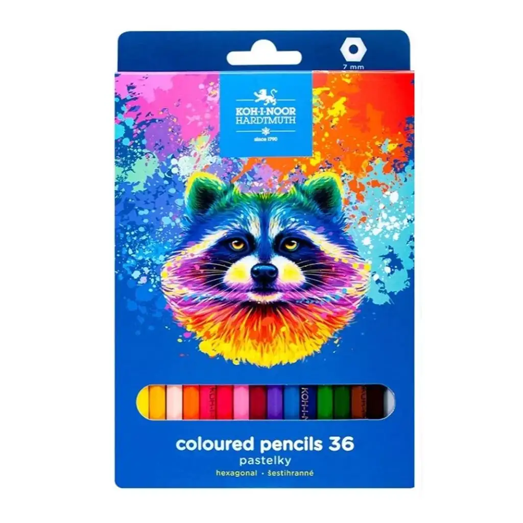 ICO: Koh-I-Noor 3555 Creioane colorate hexagonale în cutie cu raton, set de 36 bucăți