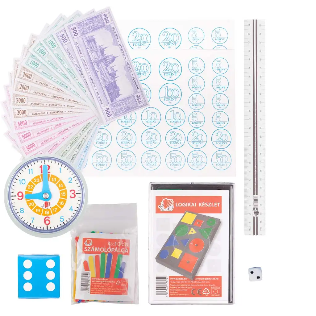 Setul conține un ceas școlar colorat, din plastic, cu care copiii pot învăța să folosească ceasul analog într-un mod jucăuș. Bețișoarele pentru numărat și setul logic îi ajută pe copii să își dezvolte abilitățile de calcul și organizare, iar zarurile și banii de jucărie permit jocuri interesante, cu scop educativ. Familiarizarea cu rigla începe încă din clasa întâi, așa că și aceasta este inclusă în pachet. Folosirea banilor de jucărie și a monedelor din hârtie este o oportunitate excelentă pentru a înțelege conceptul banilor, valoarea acestora și efectuarea unor calcule simple.