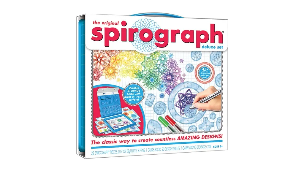 Metoda clasică pentru crearea nenumăratelor designuri! Acest set este fidel originalului, dar actualizat pentru zilele noastre. Include o geantă de transport cu spațiu de depozitare integrat, roți Spirograph, stilouri pentru proiectare, un ghid, hârtie și multe altele.