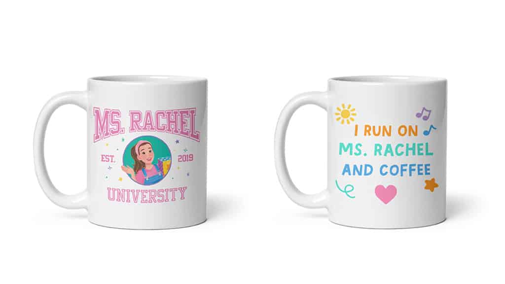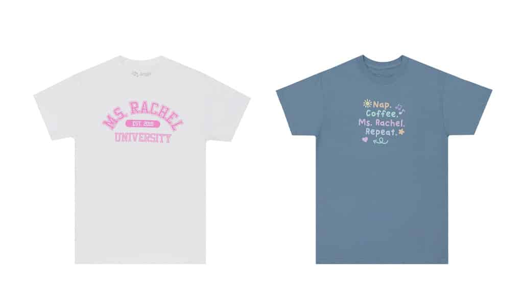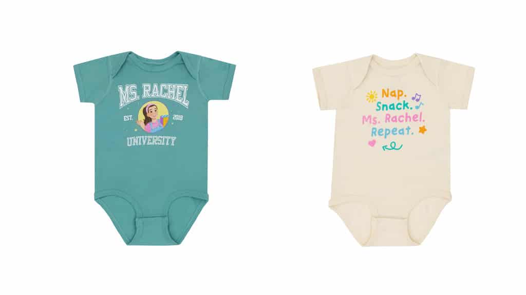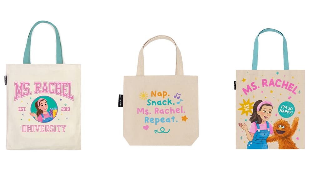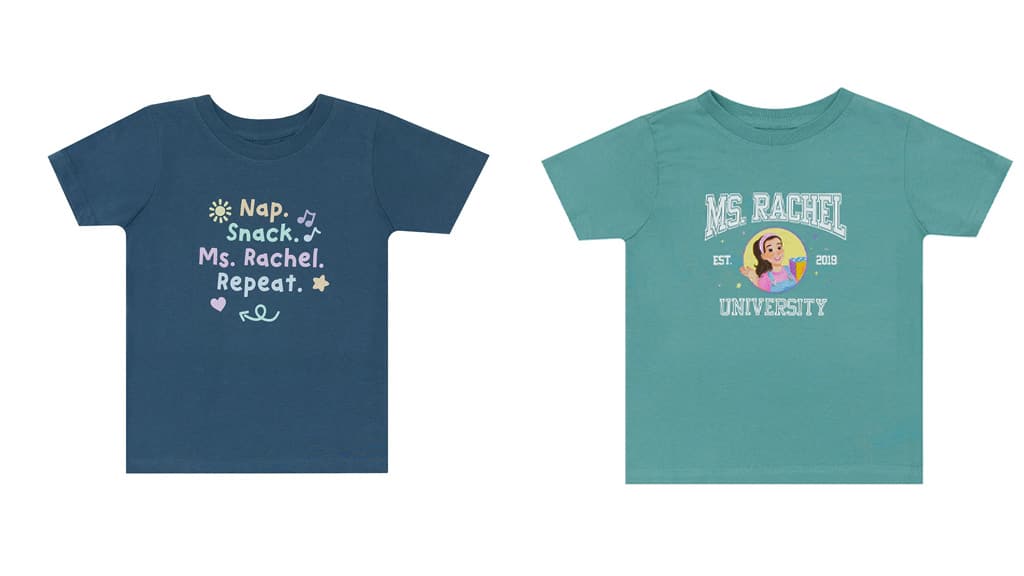 Dacă familia ta se uită împreună la Ms. Rachel, atunci vă puteți reîmprospăta garderoba împreună! Colecția Out of Print Ms. Rachel include tricouri, haine pentru bebeluși, genți, căni de cafea și multe altele, pentru toți cei care sunt cu adevărat fericiți!