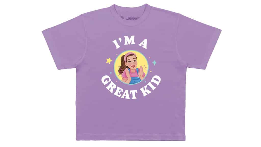 Două body-uri pentru bebeluși și trei tricouri pentru copii sunt disponibile pentru micuțul tău. Aceste articole vestimentare sunt fabricate din 100% bumbac și conțin imagini animate cu doamna Rachel (așa cum se vede și în noua ei carte ilustrată). Pe haine sunt inscripționate expresii precum „Sunt un copil grozav”, „Somn. Gustare. Doamna Rachel. Repetare” și „Universitatea doamnei Rachel”. Tricourile și body-urile sunt decorate cu icoane colorate, cum ar fi stele, note muzicale, buline și multe altele!