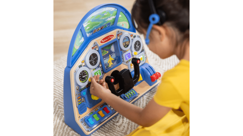 Printre alte funcții disponibile pentru zbor se numără controlul volumului, discurile de iluminare, un set de căști de pilot de joc simulat, precum și o listă de verificare reutilizabilă pentru decolare și aterizare. Pentru panoul de control sunt necesare trei baterii AA, care nu sunt incluse. Totuși, pentru a atenua turbulențele, jocul se oprește automat după aproximativ 9 minute de inactivitate, pentru a preveni descărcarea bateriilor.Tabloul de bord al pilotului de jet Melissa & Doug este distractiv chiar și de unul singur, dar câteva idei de jocuri pot ajuta copiii să se lanseze în diferite aventuri de învățare! De exemplu, își pot crea propriile aventuri de zbor, imaginându-și povești despre zboruri către țări îndepărtate, explorarea de noi teritorii sau salvarea oamenilor și animalelor de companie rătăcite. Această activitate stimulează creativitatea și ajută la dezvoltarea abilităților lingvistice și de povestire. Pe de altă parte, părinții pot planifica rute de zbor cu jucării sau marcaje pe podea pentru a naviga prin obstacole imaginare. Acest lucru îmbunătățește coordonarea mână-ochi și introduce conceptele de bază ale conștienței spațiale și ale rezolvării problemelor.