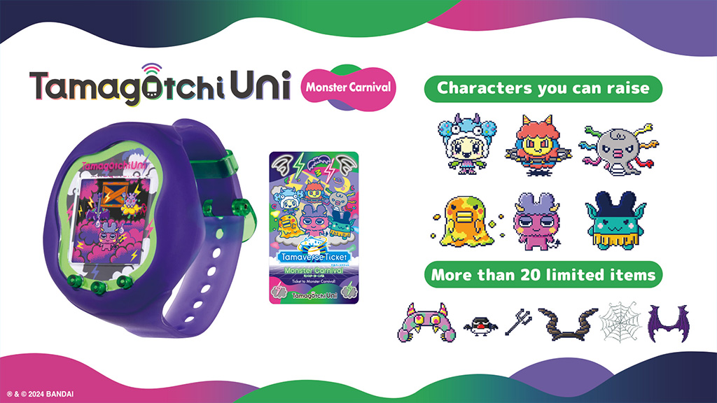 Intră în lumea Tamaverse cu a doua serie de dispozitive Tamagotchi Uni. Această colecție include noi carcase și curele, personaje în ediție limitată și mini-jocuri. Festivalul Angel aduce o atmosferă drăguță cu o curea roz și culori pastelate. Monster Carnival știe cum să facă spectacol cu designul său îndrăzneț și punk, care include nuanțe de mov închis și verde neon.