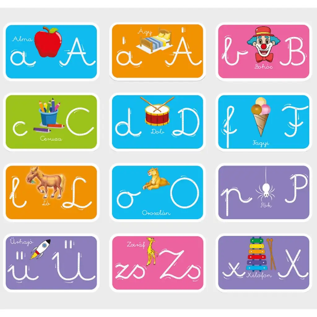 Pachetul conține 12 carduri față-verso, ștergabile, care familiarizează copiii cu literele alfabetului maghiar. Pe lângă exersarea literelor mari și mici, fiecare card conține o ilustrație veselă și un cuvânt asociat, de exemplu „A” ca măr, „B” ca clovn sau „Zs” ca girafă. Markerul ștergabil inclus permite copilului să exerseze scrierea literelor de mai multe ori, astfel încât setul poate fi folosit pe termen lung.