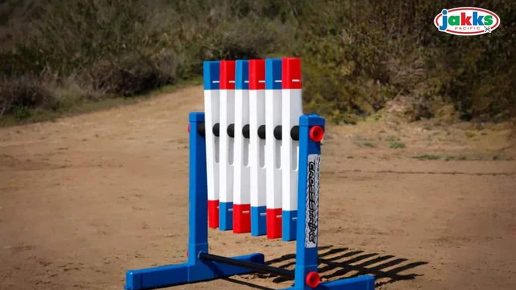 JAKKS Pacific Cross Strike este o jucărie de grădină distractivă și versatilă. Este formată din șase stâlpi de plastic, care sunt așezați pe o axă orizontală și servesc drept ținte rotative. Când sunt loviți cu un săculeț cu boabe, stâlpii se rotesc și își arată capetele albastre sau roșii. Scopul jucătorilor este să lovească țintele și să întoarcă toți stâlpii pe aceeași culoare. Cross Strike dezvoltă precizia, abilitățile motorii grosiere și gândirea strategică – toate acestea în timp ce ne jucăm afară, într-o atmosferă veselă. Acest joc este o alegere ideală pentru întâlniri de familie și cu prietenii, deoarece pot participa mai mulți jucători simultan și oferă o provocare interesantă pentru toate vârstele. Cross Strike nu doar încurajează mișcarea, ci și munca în echipă și spiritul de competiție, garantând astfel o activitate plăcută și activă în aer liber.Jakks Pacific Cross Strike este un joc competitiv și distractiv care îi încurajează pe copii să se miște. Acest joc nu este doar o modalitate excelentă de petrecere a timpului liber, ci dezvoltă și reflexele, coordonarea și spiritul de echipă. Copiii pot participa activ, în timp ce între ei se dezvoltă o competiție sănătoasă și se bucură de mișcare fie în aer liber, fie în interior. Cross Strike este alegerea ideală dacă vrei ca cei mici să se relaxeze, să lege prietenii și să se dezvolte în timp ce se joacă.
